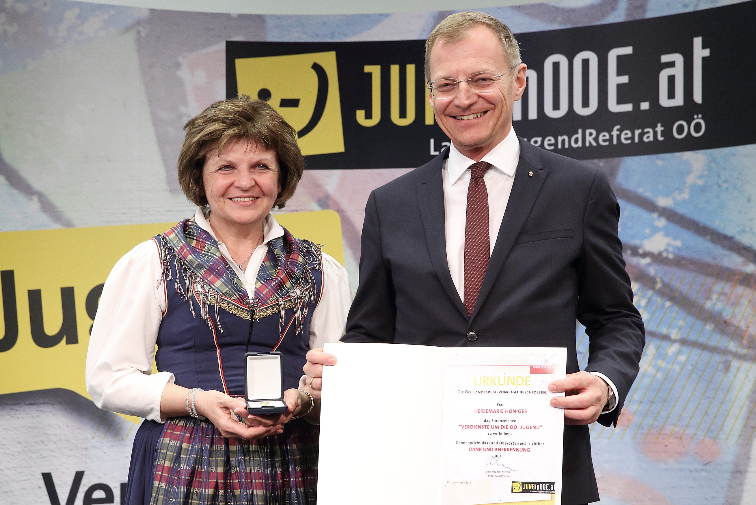 Für ihre bereits über 20 Jahre andauernde, engagierte Tätigkeit im Bereich der Jugendarbeit wurde Heidemarie Höniges kürzlich von LH Mag. Thomas Stelzer mit dem Ehrenzeichen "Verdienste um die oö. Jugend" ausgezeichnet. Sie gründete vor mehr als 2 Jahrzehnten die Kinder- und Jugendtanzgruppe im Gebirgstrachtenerhaltungsverein D'Greanwaldler und ist als Kindertanzleiterin und Ausbildnerin in ganz OÖ tätig. Weiters vermittelt sie seit 2016 im Rahmen des Projektes "Brauch und Tanz im Jahreskreis" Kindern ihr Wissen zum Thema Brauchtum und Volkstanz.